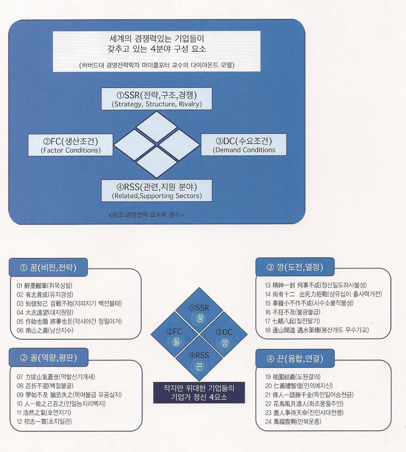 - ③ 깡 (도전, 열정): 불확실성과 위기 속에서도 굴하지 않고 끊임없이 새로운 기회를 모색하는 도전 정신과, 목표를 향해 나아가는 뜨거운 열정의 필요성을 역설한다.
